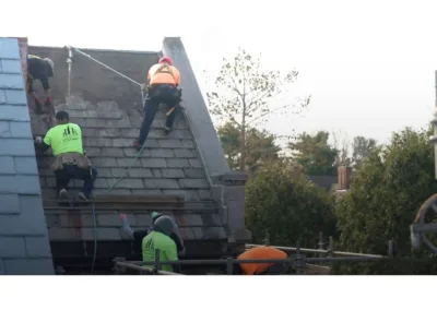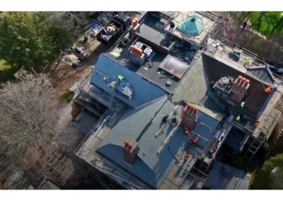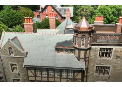 In 2024, we took the failing slate roof and completely replaced it. The project took over three months to complete, with more than 7,200 individual slates and over 20,000 copper nails spanning 2,600 square feet. The roof’s turret was also wrapped in new copper—meticulously hand-fabricated on site.